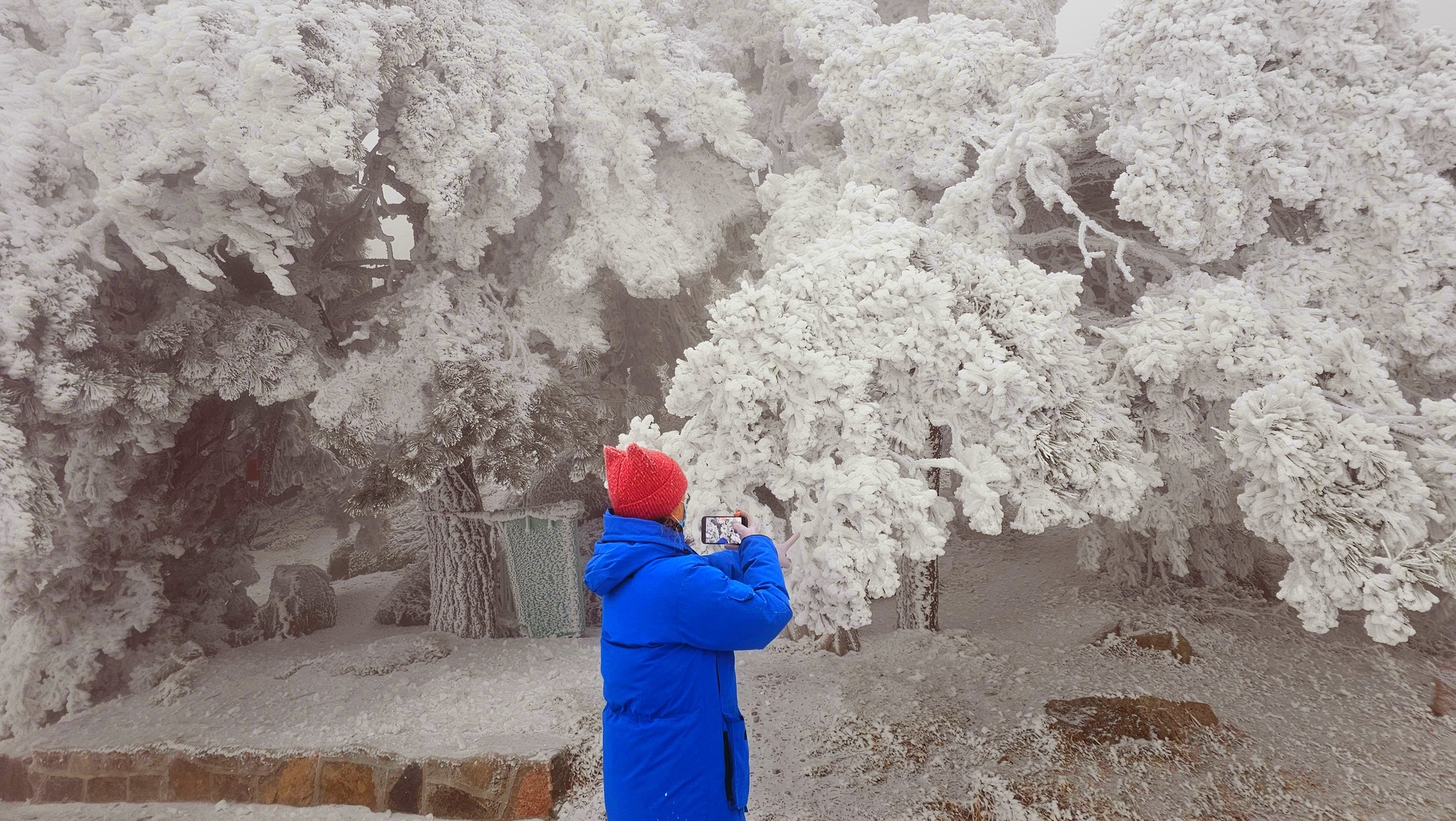 1月18日,雪后的泰山,凍雨、霧凇、雨凇與雪凇四重冰雪奇觀罕見疊加。