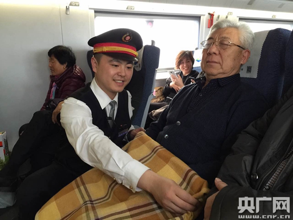 抓起半溫不熱的饅頭剛啃了兩口,陳科的對講機再次響起,這次,是七號車一位到煙臺的旅客需要輪椅。來到七號車,陳科先幫這位行動不便的旅客調了一個靠近廁所的座位,又向陪同人員囑咐了一些注意事項,然后給煙臺站打電話聯系了輪椅,并特意叮囑一位男乘務員到站時過來搭把手。