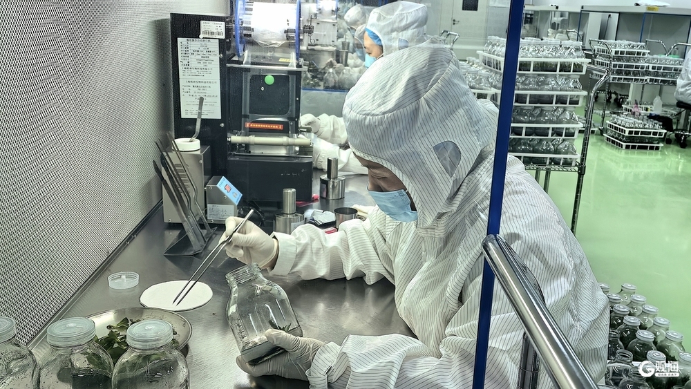 身穿白色無菌服的工作人員正使用鑷子和切刀克隆蝴蝶蘭的瓶苗。