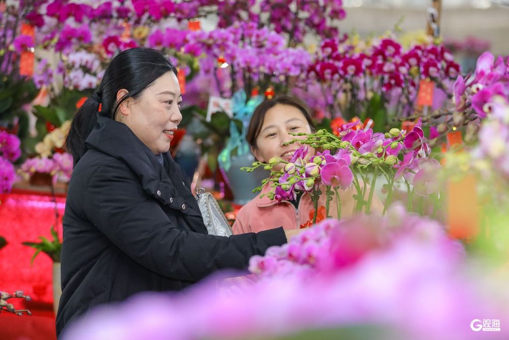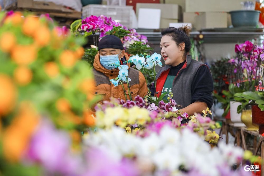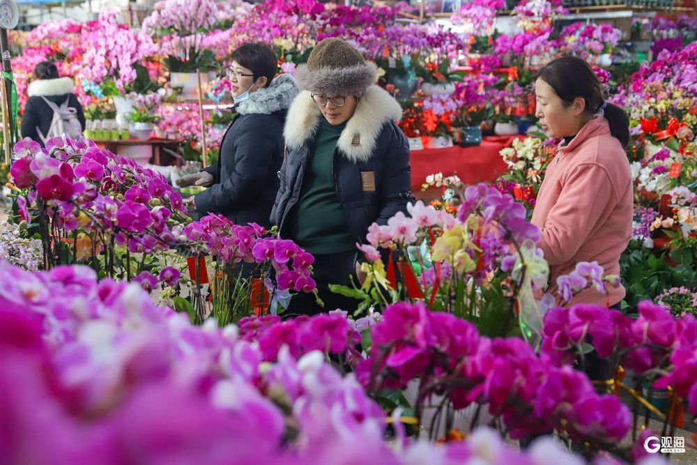 人們?cè)谏綎|省青島市李滄區(qū)李村大集選購(gòu)年宵花。