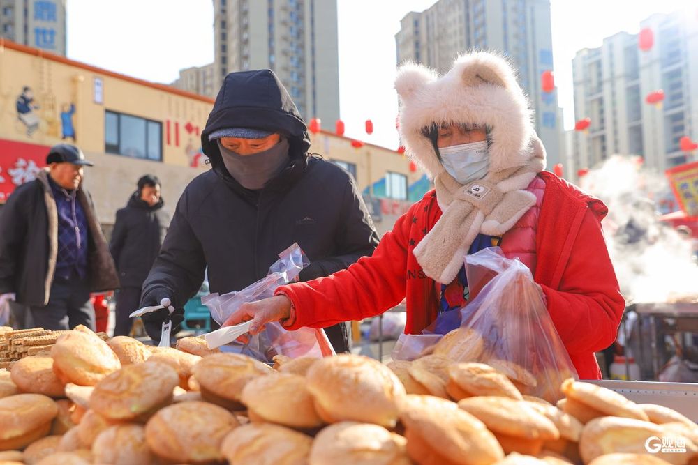 人們?cè)谏綎|省青島市李滄區(qū)李村大集選購(gòu)糕點(diǎn)。