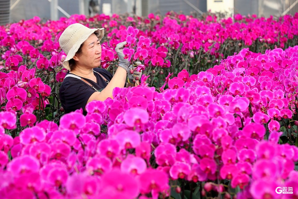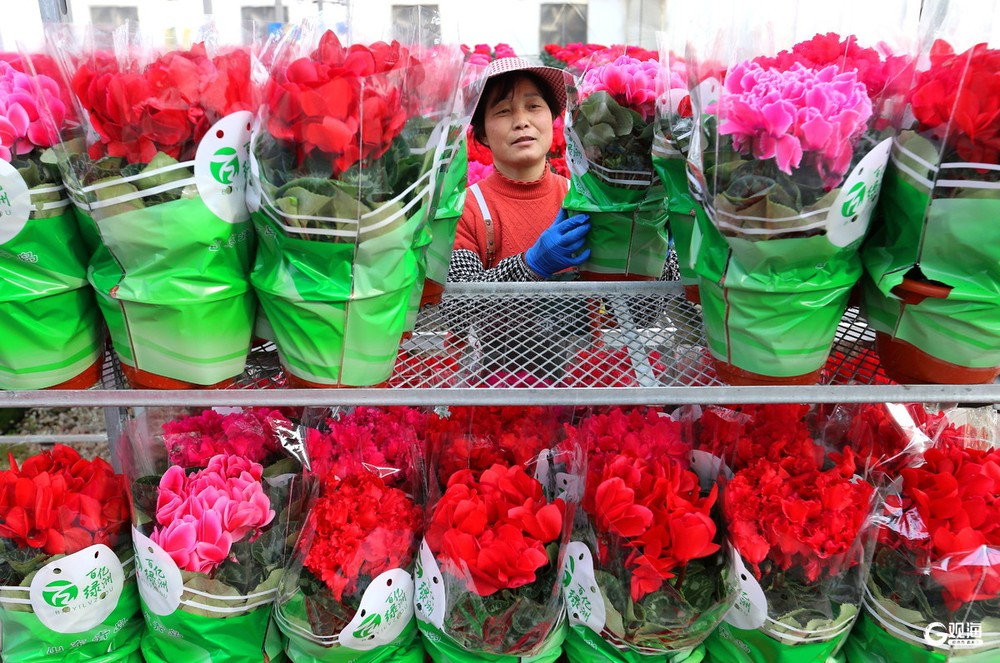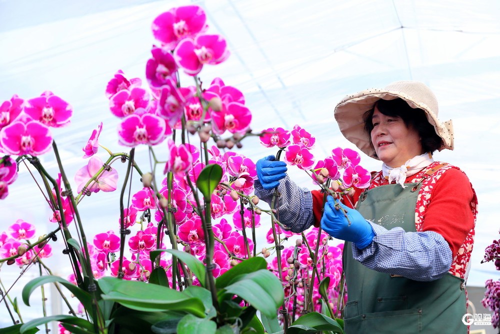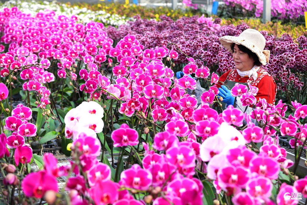 春節(jié)臨近,青島市即墨區(qū)靈山花卉文化產(chǎn)業(yè)園的年宵花迎來生產(chǎn)和銷售旺季,花卉大棚內(nèi)的蝴蝶蘭、長壽花、仙客來等競相綻放,花農(nóng)們按照訂單進行管護、修剪、整形和包裝作業(yè),外運各類花卉,供應(yīng)節(jié)日市場。
