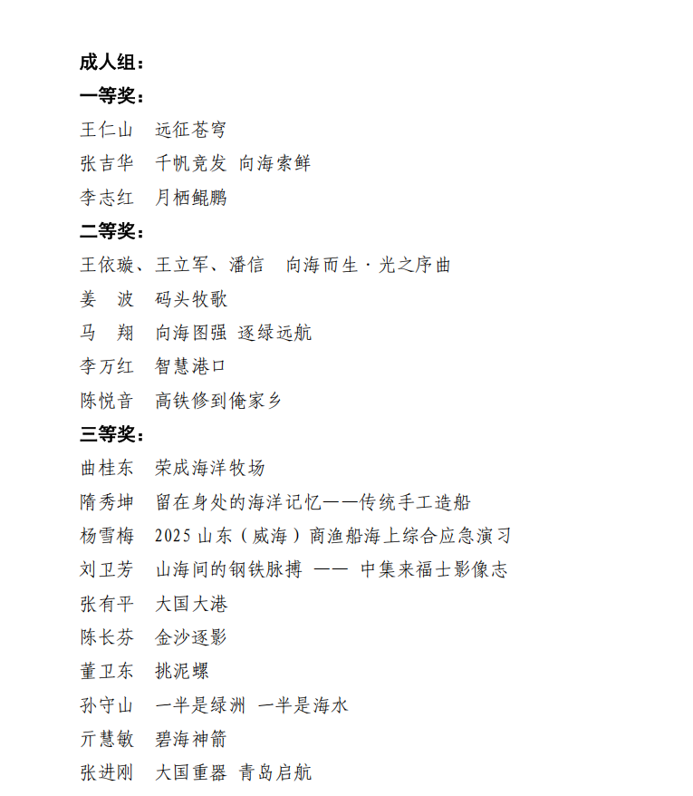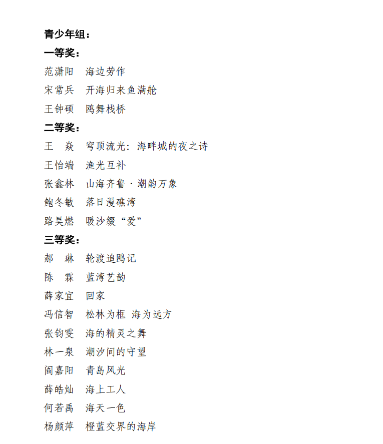 本次大賽主題為“定格藍(lán)色光影 展現(xiàn)海洋風(fēng)貌”,面向社會各界全面征集海洋強省建設(shè)優(yōu)秀攝影作品,作品征集期內(nèi),共征集到有效參賽作品1198份,經(jīng)過2輪初步篩選,共確定成人組199份作品進(jìn)入專家線上初審環(huán)節(jié),專家線上初審后,63份作品進(jìn)入線下終審。青少年組初步篩選出65份作品直接進(jìn)入線下評審環(huán)節(jié)。兩個組別各評出一等獎3名、二等獎5名、三等獎10名、優(yōu)秀獎15名,現(xiàn)將獲獎名單公示如下。
