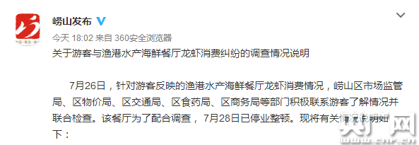 央廣網(wǎng)青島7月31日消息(記者 劉?)7月31日,青島市嶗山區(qū)人民政府新聞辦公室通過其官方微博發(fā)布對(duì)26日游客與漁港水產(chǎn)海鮮餐廳龍蝦消費(fèi)糾紛事件的調(diào)查說明。針對(duì)7月26日游客反映的漁港水產(chǎn)海鮮餐廳龍蝦消費(fèi)情況,嶗山區(qū)市場監(jiān)管局、區(qū)物價(jià)局、區(qū)交通局、區(qū)食藥局、區(qū)商務(wù)局等部門積極聯(lián)系游客了解情況并聯(lián)合檢查。據(jù)了解,該餐廳為了配合調(diào)查,7月28日已停業(yè)整頓。