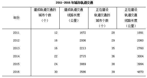 《公報(bào)》顯示,2016年年末,全國(guó)有30個(gè)城市建成軌道交通,線(xiàn)路長(zhǎng)度3586公里,分別比上年增加6個(gè)城市,增長(zhǎng)16.8%,車(chē)站數(shù)2383個(gè),其中換乘站541個(gè),配置車(chē)輛數(shù)19284輛。