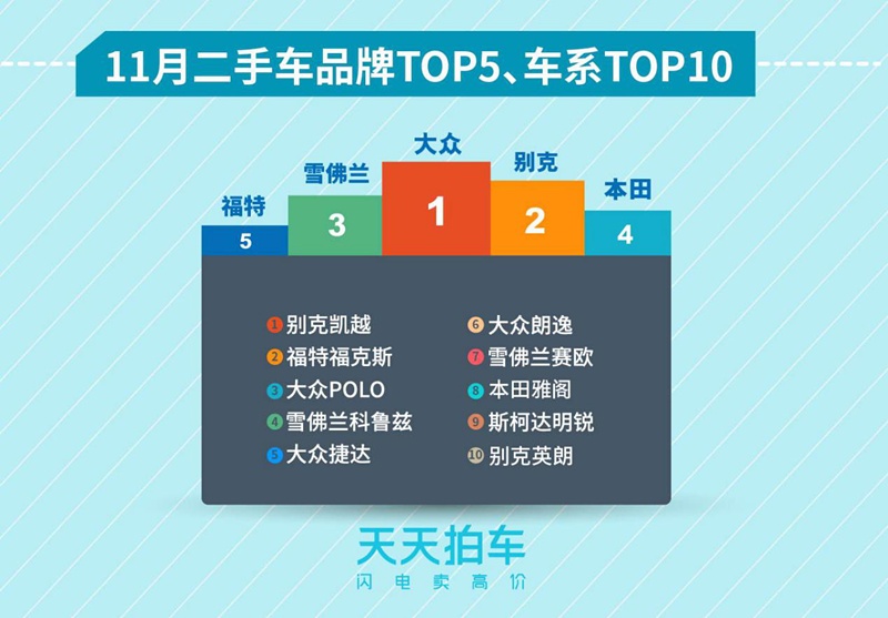二手車線上拍賣平臺(tái)天天拍車近日發(fā)布《2017年11月個(gè)人賣車大數(shù)據(jù)報(bào)告》。據(jù)統(tǒng)計(jì),不同的地域和城市二手車熱銷品牌車型也有所不同,在全國(guó)10大一二線城市中,上海、廣州別克凱越二手車銷量占比最高,更顯商務(wù)范。