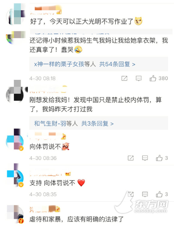 雖然“國際不打小孩日”家長們認(rèn)同度不高,但在孩子們看來,“國際不打小孩日”似乎給了他們提供了一個(gè)“淘氣”的理由。不少學(xué)生網(wǎng)友在網(wǎng)上評(píng)論:“好了,今天可以光明正大地不寫作業(yè)了”、“向體罰說不!”……網(wǎng)友“幽默大傻”還回憶了自己小時(shí)候挨打的“慘痛經(jīng)歷”,“小時(shí)候惹我媽生氣我媽讓我給她拿衣架,我還真拿了!”,網(wǎng)友“雨神早點(diǎn)睡”則表示“想早點(diǎn)發(fā)給我媽!昨天剛被打過!