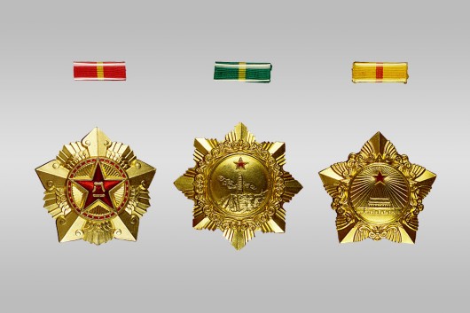 這是1955年中華人民共和國主席授予朱德的一級八一勛章、一級獨立自由勛章、一級解放勛章。1955年2月,第一屆全國人民代表大會常務(wù)委員會第七次會議通過了《關(guān)于規(guī)定勛章獎?wù)率谟柚袊嗣窠夥跑娫谥袊嗣窀锩鼞?zhàn)爭時期有功人員的決議》和《中華人民共和國授予中國人民解放軍在中國人民革命戰(zhàn)爭時期有功人員的勛章獎?wù)聴l例》。條例規(guī)定,勛章獎?wù)戮譃椤鞍艘弧薄蔼毩⒆杂伞薄敖夥拧比N,勛章每種分一、二、三級,獎?wù)虏环旨。八一勛章授予在中國工農(nóng)紅軍時期參加革命戰(zhàn)爭的有功人員,一級授予當(dāng)時師級以上干部;獨立自由勛章授予在抗日戰(zhàn)爭時期參加革命戰(zhàn)爭的有功人員,一級授予中國工農(nóng)紅軍改編為八路軍時的旅級和相當(dāng)于旅級以上干部;解放勛章授予在解放戰(zhàn)爭時期參加革命戰(zhàn)爭的有功人員,一級授予解放戰(zhàn)爭時期軍級以上及其相當(dāng)干部。1980年4月,由朱德夫人康克清捐贈軍事博物館。