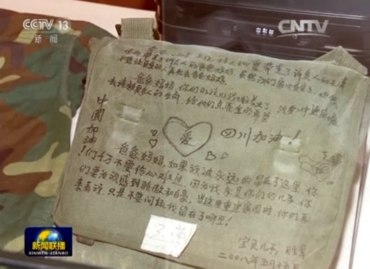 汶川地震搶險救災(zāi)戰(zhàn)士寫在挎包上的遺書