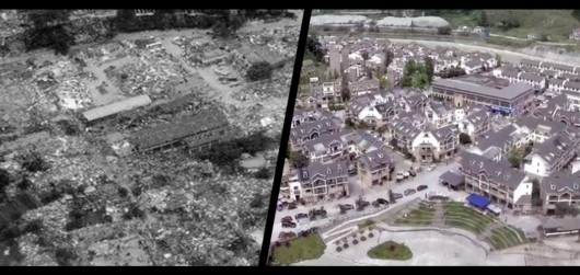 左圖:空中看地震后的汶川縣映秀鎮(zhèn)。  右圖:重建后的汶川縣映秀鎮(zhèn)。