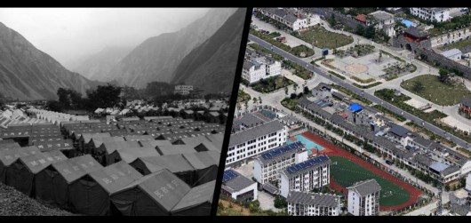 左圖:2008年6月18日拍攝的四川省汶川縣綿虒鎮(zhèn)震后臨時安置點(新華社記者海明威攝)。
