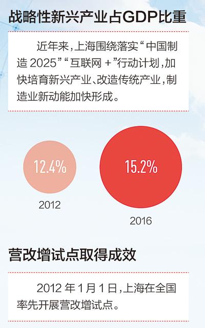 過去5年,上海全市生產(chǎn)總值年均增長7.2%,2016年超2.7萬億元;第三產(chǎn)業(yè)增加值占比上升到目前的70%左右,服務(wù)業(yè)為主的產(chǎn)業(yè)結(jié)構(gòu)基本形成;戰(zhàn)略性新興產(chǎn)業(yè)加快發(fā)展,2016年,占全市生產(chǎn)總值比重達(dá)到15.2%。