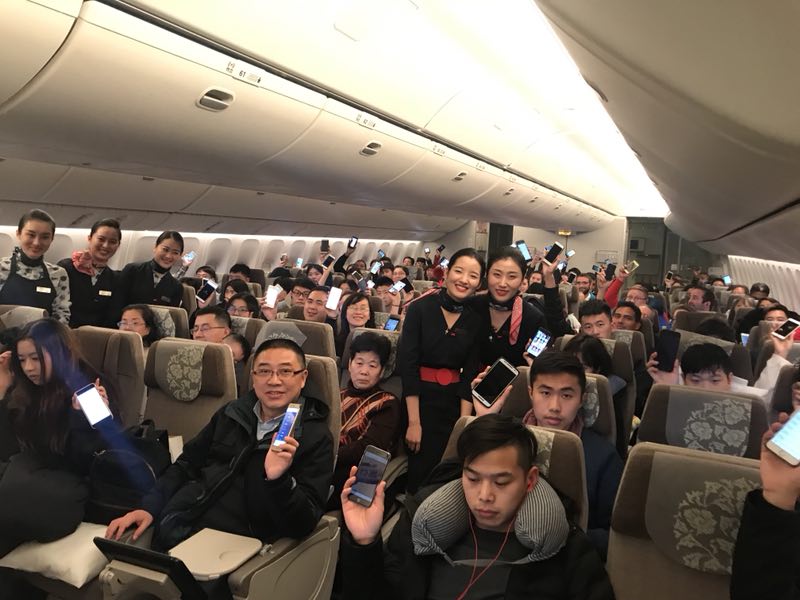 17日中午11:46起飛、18日凌晨1:48落地的MU587上海—紐約是全民航最早起飛的跨零點“空中開機”航班。意外聽到廣播的旅客們成功抓住了率先嘗鮮手機上網(wǎng)的“末班車”,而不少旅客已從其他移動設(shè)備提前獲悉了消息,早早地拿出手機等待開機。不少旅客還用“朋友圈”、“紅包”、直播等形式,分享喜悅、留下紀念。北京時間18日零點,東航共有181航班正在執(zhí)行之中,機上的旅客共同成為中國民航歷史上第一批在飛機上合規(guī)使用手機的人。