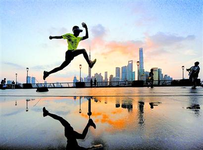 外灘的清晨,一位市民迎著晨曦奔跑。 視覺中國(guó)供圖