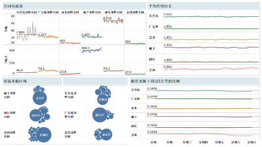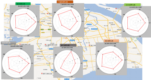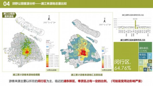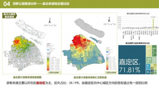 熱力圖顯示,在嘉北郊野公園,游客集中在1號門附近景區(qū),游覽與觀光車路線一致。長興島郊野公園,游客集中在靠近高速公路的燒烤區(qū)和環(huán)保博物館。青西郊野公園,游客大多沿著湖泊觀光。浦江郊野公園,“活力森林區(qū)”“奇跡花園區(qū)”是熱門景點。廣富林郊野公園,“房車營地”“敞篷營地”“馬術俱樂部”是游客聚集地。