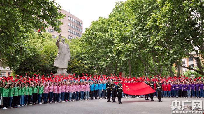 同濟(jì)大學(xué)校史館前,馬克思主義學(xué)院思政理論課教師與學(xué)院學(xué)生、同濟(jì)大學(xué)學(xué)生習(xí)近平新時代中國特色社會主義思想學(xué)習(xí)研究會學(xué)子一道,深情放歌同濟(jì)大學(xué)原創(chuàng)歌曲《青春中國》:“多少次夢中訴說,你是我豪邁的祖國,世代的勞作,汗水澆灌了秧禾……”火紅的T恤,激蕩著熾熱的愛國之情。馬克思主義學(xué)院特聘教授陳大文說:“愛國是一種深沉的情懷,表達(dá)這種情懷需要儀式感。今天我們與學(xué)生共同唱歌抒懷,讓此時此刻顯得格外不同,它能喚醒我們的真情,使我們感到特別莊嚴(yán)和神圣。我相信,它能凝聚起磅礴的愛國力量!