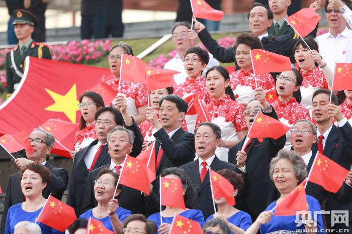 在華東師范大學(xué)閔行校區(qū)圖書館前,當(dāng)《我和我的祖國》唱至高潮,現(xiàn)場沸騰了。這富有感染力的歌聲里流淌著砥礪報國的紅色血液,師生同唱一首歌,銘記崢嶸歷史,共同感受蓬勃涌動的愛國熱情。