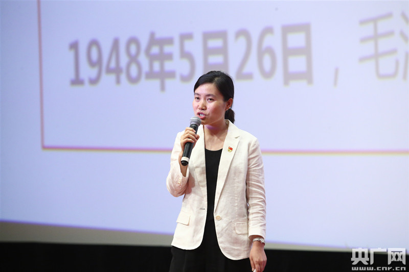 首堂示范課由上海市委黨校副教授桑麗和臺下一千多名黨員重溫了《彰顯“致勝基因”的西柏坡精神》。(央廣網(wǎng)發(fā) 上影集團提供)