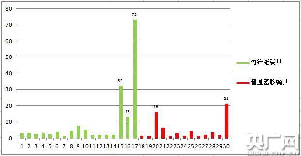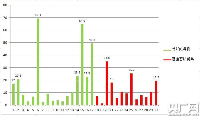 本次比較試驗共計購買30件樣品,其中線上16件,線下14件,包括了17件標稱含竹纖維的餐具,13件普通密胺餐具,價格從7.9元至89元不等。