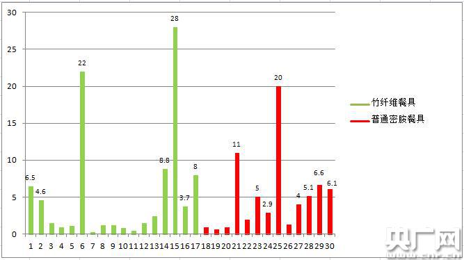 本次比較試驗對17件竹纖維餐具和13件普通密胺餐具的材質(zhì)進行了檢測。測試結(jié)果顯示,28件樣品表層與內(nèi)層材料均為三聚氰胺甲醛樹脂,2件樣品分別檢出脲醛樹脂與聚氨酯,其中標稱由廣州好耐日用品有限公司生產(chǎn)的密胺仿瓷餐盤五格,其內(nèi)層主體材質(zhì)檢測出含脲醛樹脂,而脲醛樹脂并不在國家標準允許的食品接觸產(chǎn)品塑料樹脂清單中,且在使用中易析出甲醛和尿素,安全性和耐用性均不及三聚氰胺甲醛樹脂。數(shù)據(jù)顯示,竹纖維餐具內(nèi)外主體材質(zhì)均為三聚氰胺甲醛樹脂,只是添加了一定比例的竹纖維填料,與普通密胺餐具無本質(zhì)區(qū)別。
