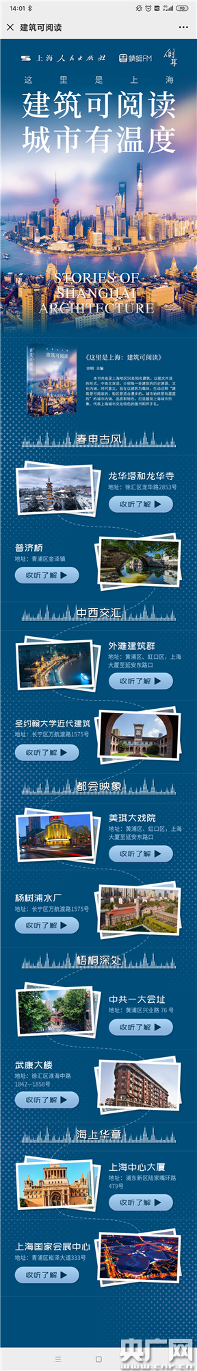 作為“建筑可閱讀”文旅融合工作的重點項目,上海城市推廣中心出品的《這里是上海:建筑可閱讀》已于今年上海書展期間隆重亮相。《這里是上海:建筑可閱讀》有聲版也于今天首發(fā)。由有聲版邀請了“側(cè)耳”團隊印海蓉、施琰、陶淳、王幸、林牧茵、徐惟杰、臧熹和葉子龍等八位滬上知名的新聞主播、主持人參與錄制,讓上海的知名建筑可見、可讀、可聽,為廣大讀者帶來全新的視聽體驗。