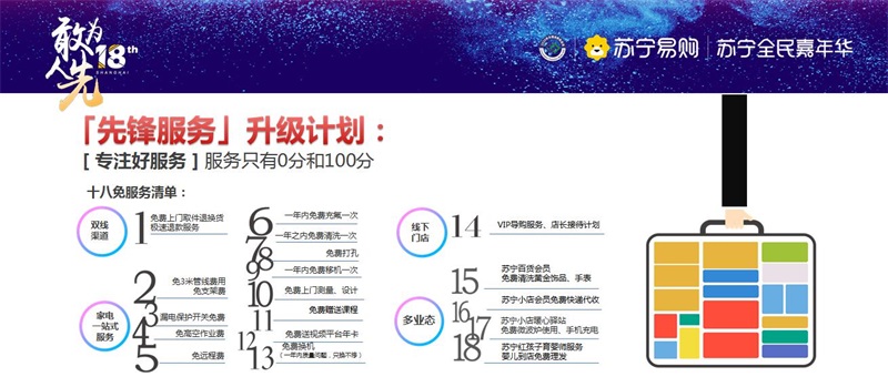 在上海地區(qū) ,蘇寧也為消費(fèi)者“量身定制”了一套完整的、系統(tǒng)化、規(guī)范化的“十八免服務(wù)清單”,涵蓋家電、母嬰、百貨、快消等領(lǐng)域。