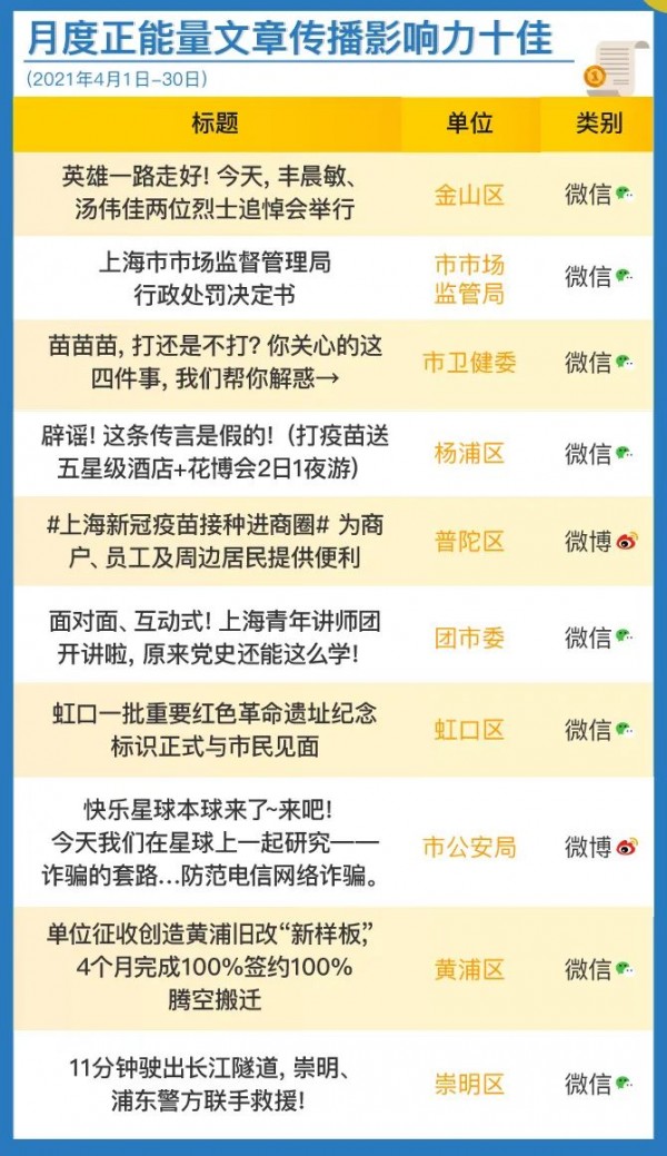 本月正能量十佳稿件中,金山區(qū)致敬消防“逆行英雄”;市市場監(jiān)管局教科書式“行政處罰書”獲網(wǎng)友點贊;市衛(wèi)健委就新冠疫苗接種問題為群眾解疑答惑,楊浦區(qū)及時澄清有關(guān)疫苗接種謠言,普陀區(qū)發(fā)布疫苗接種便民信息;團市委、虹口區(qū)圍繞黨史學(xué)習(xí)教育開展宣傳,營造紅色學(xué)習(xí)氛圍;市公安局借助名人效應(yīng)擴大防范網(wǎng)絡(luò)詐騙傳播效果;黃浦區(qū)公布近期舊改情況,推動精細化管理;崇明區(qū)刊發(fā)暖新聞,點贊城市正能量,均獲得網(wǎng)上較高關(guān)注。