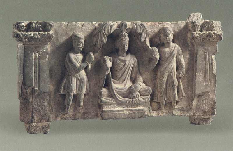 貴霜王朝時期,對于亞歷山大東征后留下的種種希臘羅馬藝術(shù),對來自西邊的伊朗高原上的瑣羅亞斯德教、東南邊印度半島的印度教和佛教,都采取了兼收并蓄的包容態(tài)度,這極大豐富了貴霜時期的藝術(shù)表達(dá)方式。展覽中的“豐收女神坐像”是希臘藝術(shù)中常用到的素材,女神衣裙紋線流暢優(yōu)美,右手上舉,左手于膝頭持握豐饒角(Cornucopia),表情慈祥。從此件雕塑中,可以看出希臘藝術(shù)在貴霜地區(qū)的深入影響。另一件展品“禮拜佛陀建筑構(gòu)件”上的浮雕描述了菩薩、供養(yǎng)人共同聆聽釋迦牟尼說講佛法的場景,象征希臘建筑雕塑的科林斯柱頭與講經(jīng)說法場景協(xié)調(diào)于一處。