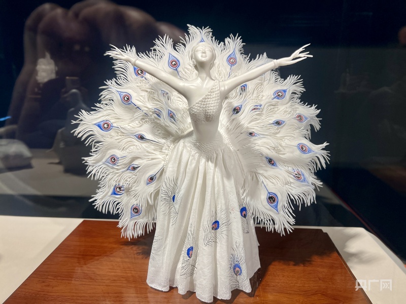 現(xiàn)場展品涵蓋了德化瓷的主要品種,既有傳統(tǒng)經(jīng)典之作,也有現(xiàn)代創(chuàng)新精品。其中,重量級展品格外引人注目。連德理的《神話》以電影《神話》中玉漱公主為原型創(chuàng)作,薄如蟬翼、飄逸如風(fēng),遠觀如紗,近看為瓷,堪稱德化白瓷工藝的重大突破。連紫華的《極彩·如愿多寶佛》采用德化頂級象牙瓷,融合唐卡礦物彩繪,紅寶石、綠松石、朱砂、藍寶石在瓷胎上交相輝映,打破德化瓷“單一白”的傳統(tǒng)印象,為世界陶瓷史開創(chuàng)先河。