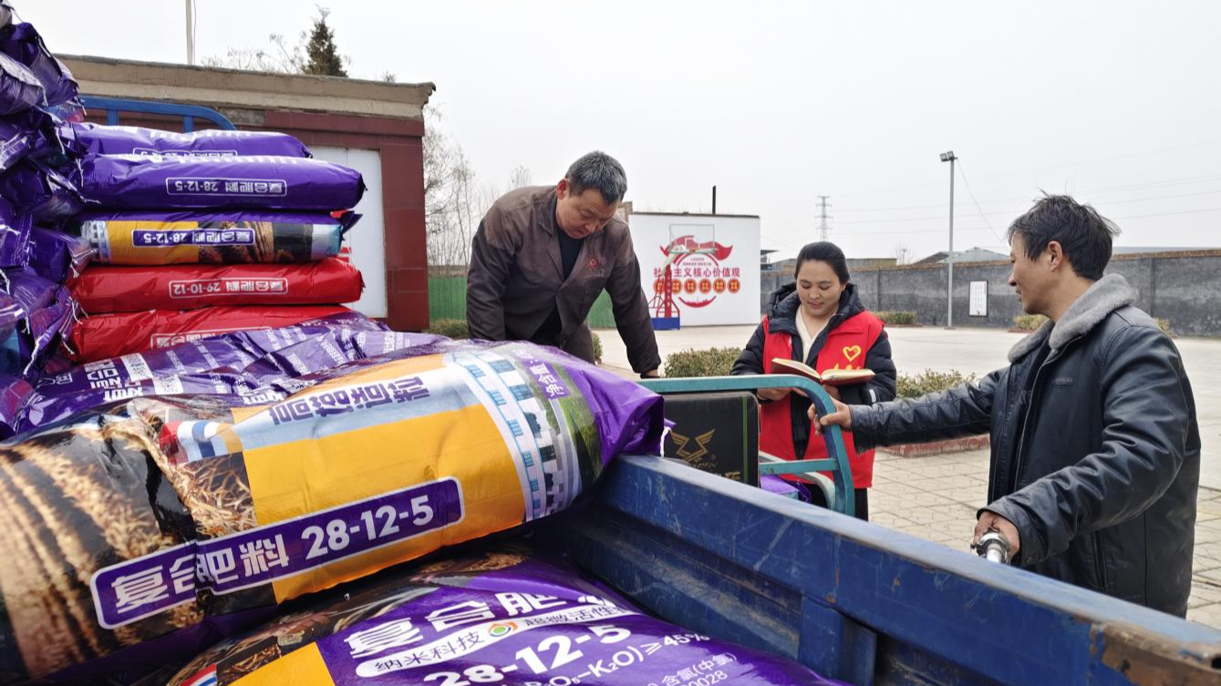 統(tǒng)一采購的優(yōu)質(zhì)化肥發(fā)放到居民手中(呂梁市委組織部供圖)