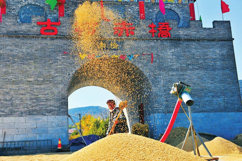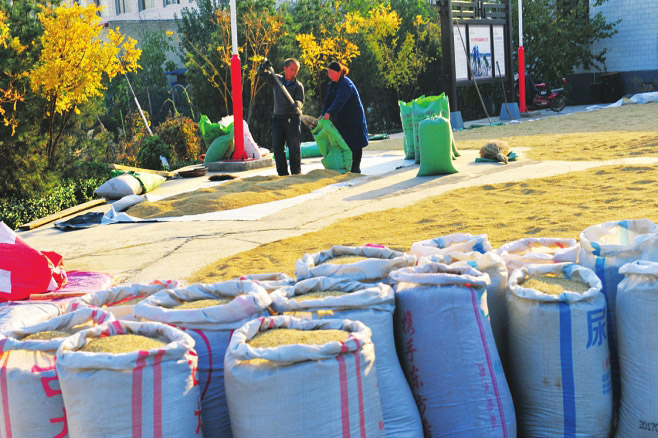赤橋村村頭,金秋稻米打場(chǎng)成為古村一景。