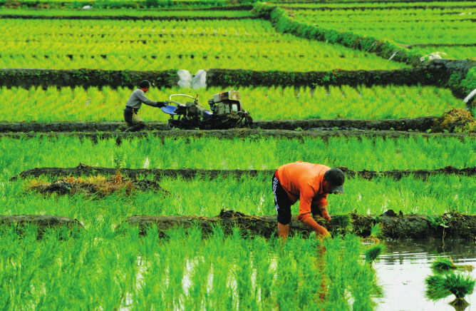 春播時(shí)節(jié),村民勞作在地頭,放眼望去波光粼粼、稻禾茵茵。