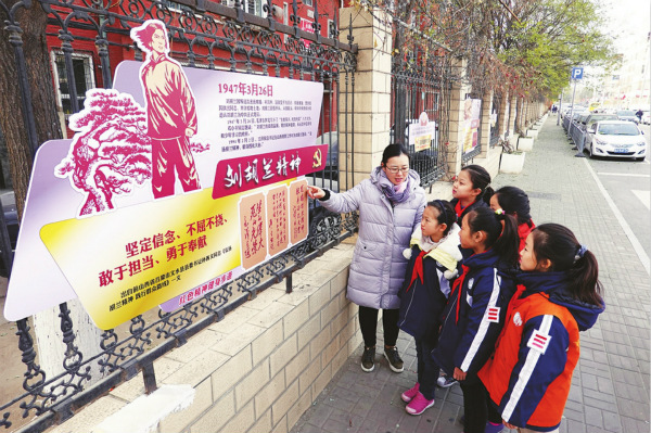 12月3日,社區(qū)志愿者正向太原市濱河小學(xué)的小學(xué)生講述“劉胡蘭精神”。為了提高社區(qū)文化氛圍,太原市迎澤區(qū)勁松社區(qū)在濱河小學(xué)附近的桃園南路西一巷,創(chuàng)建了百米長(zhǎng)的“紅色精神”文化長(zhǎng)廊。