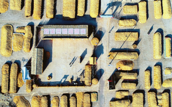 1月17日,俯瞰昔陽縣閆莊鄉(xiāng)閆莊村,豐收廣場格外醒目。為進(jìn)一步挖掘旅游資源,閆莊鄉(xiāng)別出心裁,在閆莊村口18余畝的玉米堆場上用10余萬穗、2萬余公斤玉米,打造出一個別具特色的豐收廣場,