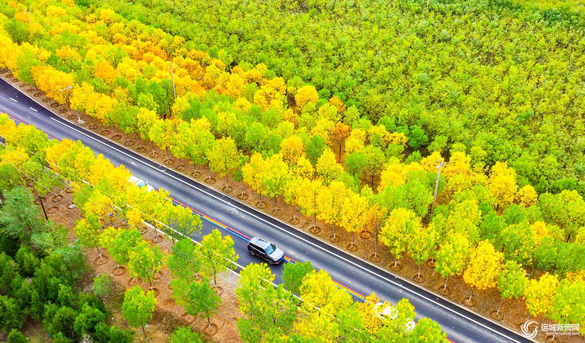 10月21日,汽車駛過中心城區(qū)至運城市鹽湖區(qū)東郭鎮(zhèn)道路。秋日的陽光透過疏朗的枝椏,灑在寬闊的彩虹路上,兩側的槐樹褪去濃綠,葉片被秋霜染成金黃,像掛起了千萬片金箔,呈現(xiàn)出一幅多彩的秋日圖景。(姚中吉)