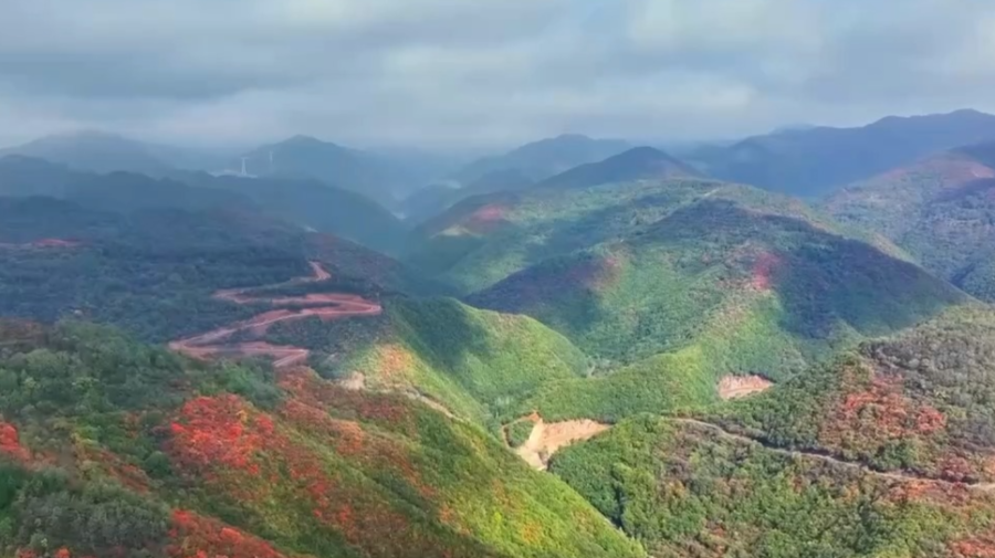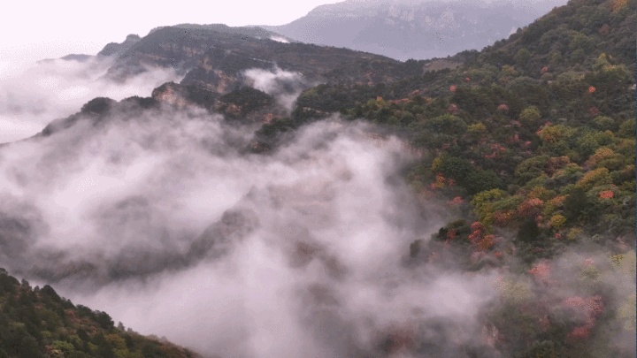 云海之外,層林盡染——黃櫨緋紅、松柏蒼翠、欒樹鎏金,各類樹種隨山勢起伏,織就一片斑斕秋錦。