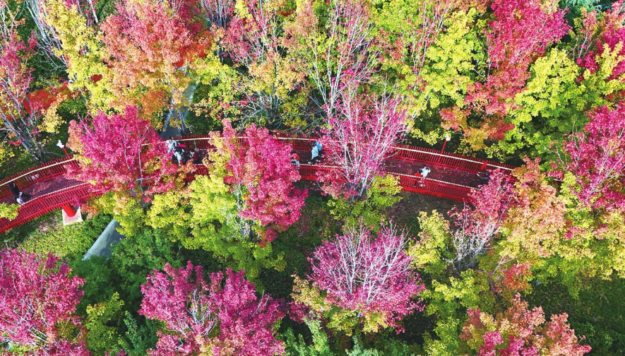 紅、黃、綠色的楓樹葉片交織如畫,引來市民游客打卡拍照,享受秋日浪漫。