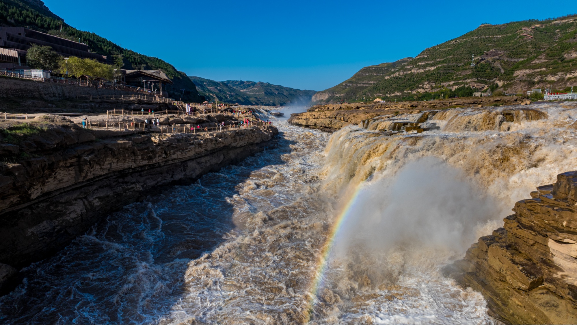 近日,黃河壺口瀑布景區(qū)出現(xiàn)壯麗彩虹景觀,吸引眾多游客駐足觀賞、拍照留念。