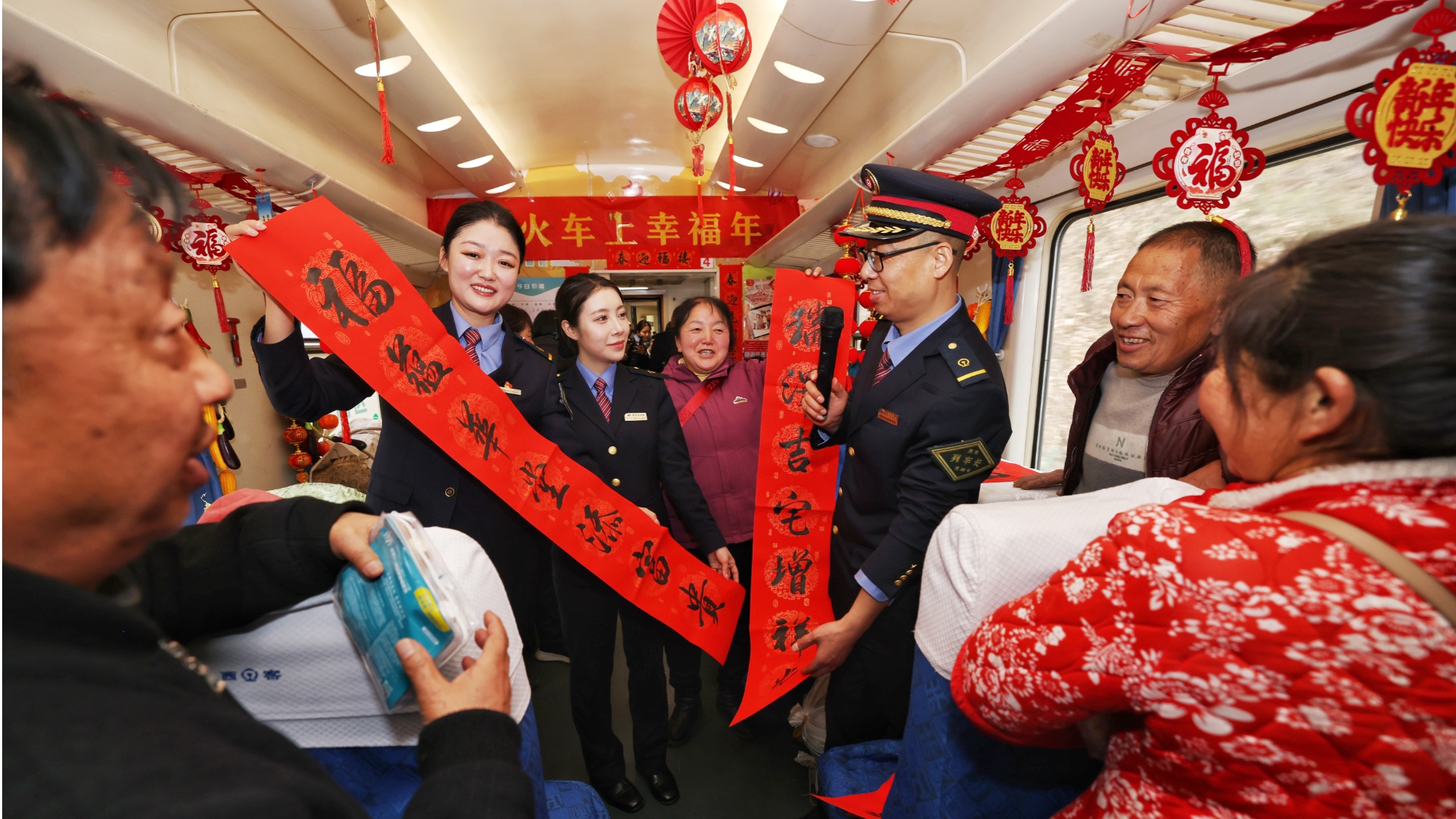 2月9日,農(nóng)歷北方小年前夕,穿行于陜甘川交界秦嶺山區(qū)的6063/6064次公益慢火車里張燈結(jié)彩,年味融融。
