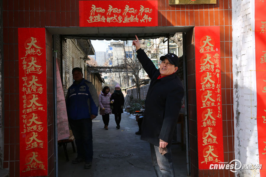 西部網(wǎng)訊(記者魏永賢) 2月3日,西安文藝北路,64歲的對聯(lián)達(dá)人郭增發(fā)在家屬院大門口掛出18個狗(犬)72字的狗年創(chuàng)意套字春聯(lián),上聯(lián)是“犬呼佳音”“犬傳福音”“犬喚春來”“犬守盛世”“犬鬧春風(fēng)”“犬兆豐登”“犬報平安”;下聯(lián)是“犬臥福門”“犬護(hù)福宅”“犬聲遠(yuǎn)揚(yáng)”“犬來旺旺”“犬唱迎客”“犬踏山河”“犬迎五福”;橫批 “狗踏春梅”“狗犬報春”“狗唱雞鳴”“狗年大吉”。