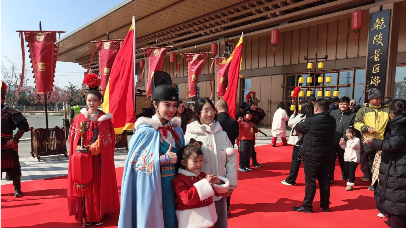 2月18日,大年初二,乾陵游客服務(wù)中心廣場(chǎng)游人如織。融合唐文化與現(xiàn)代科技的各類精彩表演輪番上演,讓游客目不暇接。