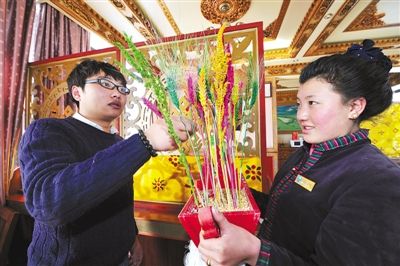 春節(jié)、藏歷新年期間,我區(qū)旅游市場持續(xù)升溫,大批游客進(jìn)藏過年,游客們在領(lǐng)略西藏獨特自然風(fēng)光的同時,還感受了藏歷新年的節(jié)日氛圍。圖為來自河南的游客(左)在拉薩感受藏族傳統(tǒng)儀式吃“切瑪”。本報記者 旦增西旦 攝