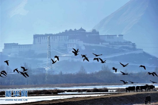 水鳥飛翔在拉魯濕地上空(1月7日攝)。入冬以來,位于拉薩城邊的拉魯濕地國家級自然保護(hù)區(qū)候鳥增多,斑頭雁、赤麻鴨、野鴨等數(shù)十種候鳥在這里過冬。拉魯濕地國家級自然保護(hù)區(qū)海拔3600多米,總面積12.64平方公里,是中國海拔最高、面積最大的城市天然濕地,被譽(yù)為“拉薩之肺”。新華社記者 張汝鋒 攝
