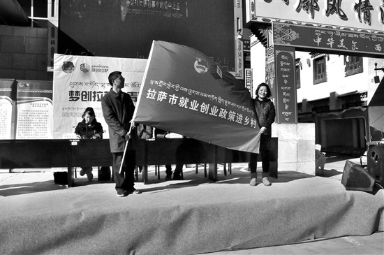 圖為城關(guān)區(qū)政府相關(guān)負責(zé)人將拉薩市就業(yè)創(chuàng)業(yè)政策進鄉(xiāng)村旗幟授予共青團城關(guān)區(qū)委員會負責(zé)人。本報記者 齊永昌攝