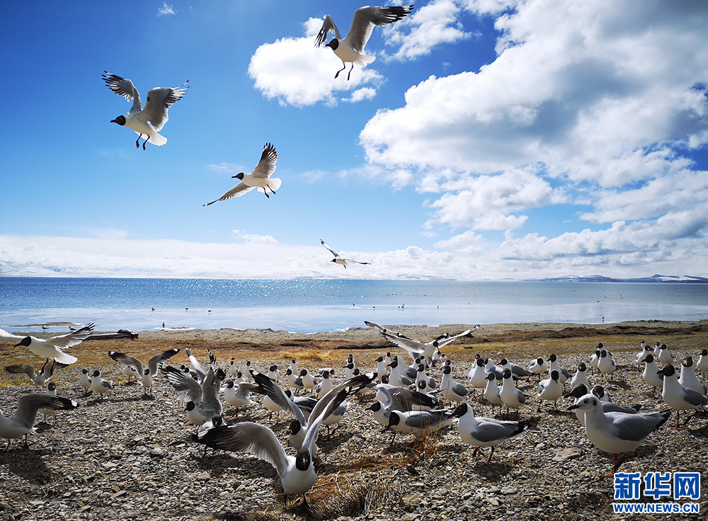 圣湖瑪旁雍措旁飛舞的海鷗。新華網記者 張宸攝