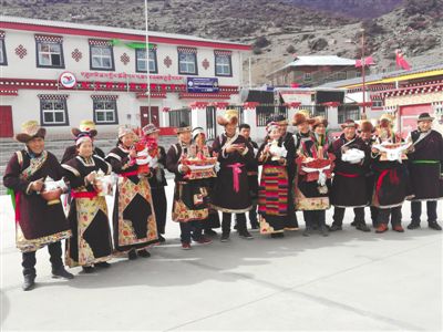 “我們這里的傳統(tǒng),就是在新年的早上,每家出一個代表,帶上自釀的青稞酒,挨家挨戶去拜年!卑菽觋犖槔锏乃骼拾椭榇舐暤叵蛴浾呓榻B道。