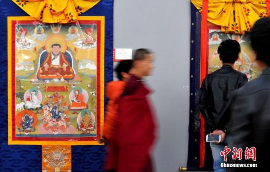 圖為觀眾欣賞展覽中的唐卡。 李林 攝