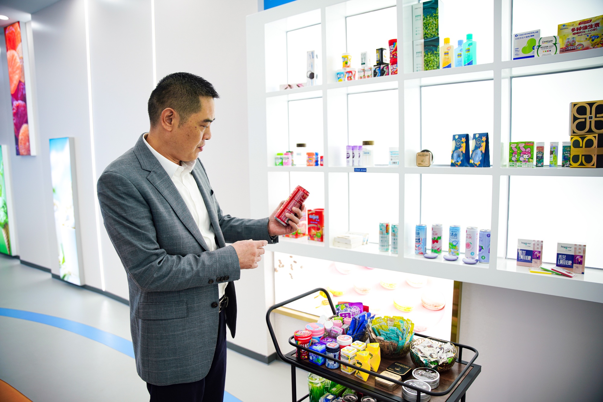 鄭芳明向記者介紹糖醇的應用產品(央廣網記者 尚天宇 攝)