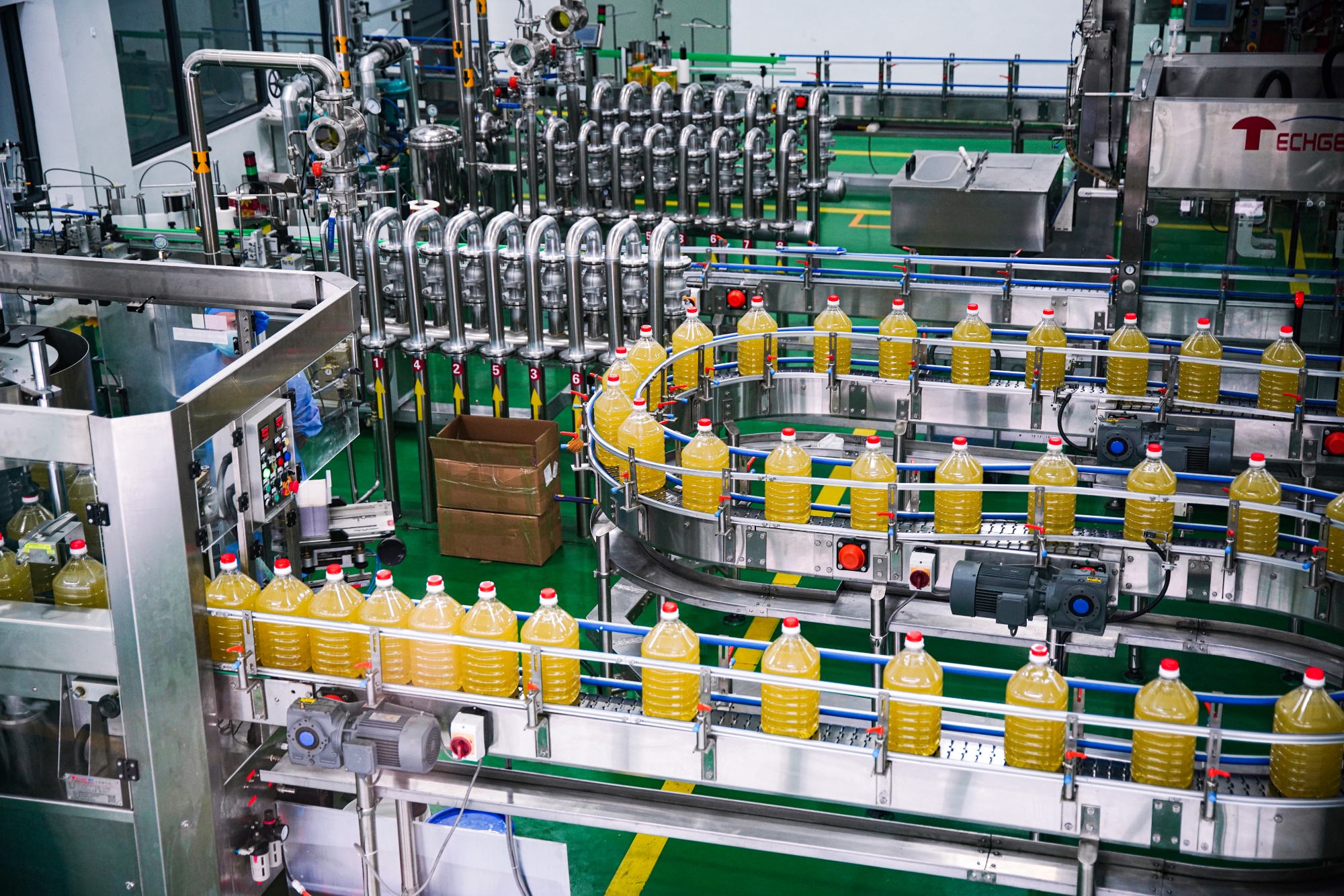在舟山良海糧油有限公司生產車間內,現代化糧食加工流水線有條不紊。大豆經過預處理、浸出、精煉等加工環(huán)節(jié),變成油品和豆粕,現場,一桶桶成品包裝油正通過傳送帶打包裝箱。