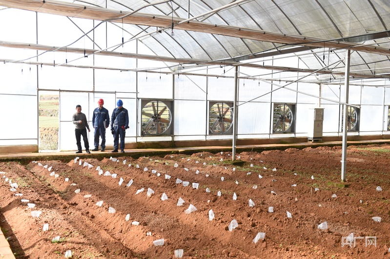 智能溫控大棚內(nèi),管理人員和電力人員查看智能設(shè)備使用情況(央廣網(wǎng)發(fā) 陳舉 攝)